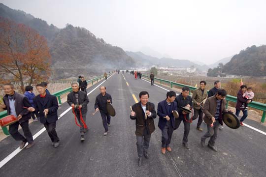 11月10日,大別山旅游扶貧快速通道水毀修復工程漁潭段改線建成通車。當?shù)卮迕袂描尨蚬?、載歌載舞,以自己特有的方式歡慶這一時刻的到來.
